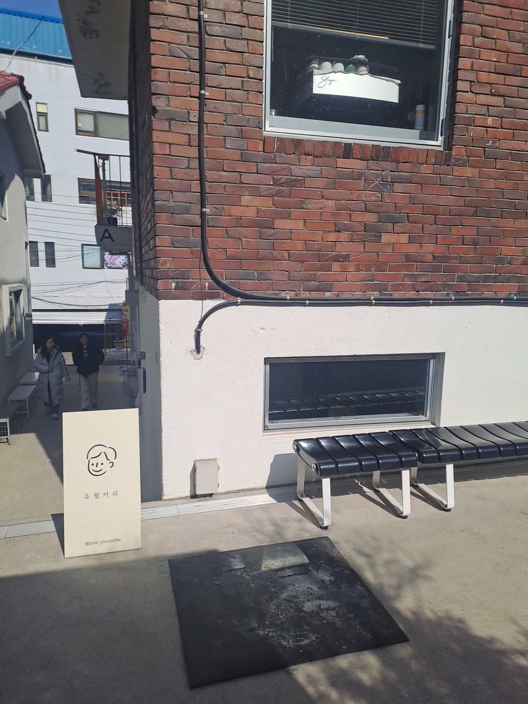이렇게 주택이 밀집한 골목길 사이로 들어가면, 나타나는 유월커피 출입문! 이날 날씨도 맑고 화창해서 더 여행온 듯한 기분도 들고 약간 성수 뒷 동네 송정동 느낌도 나면서 한적하고 기분이 좋았답니다~ ㅎㅎ