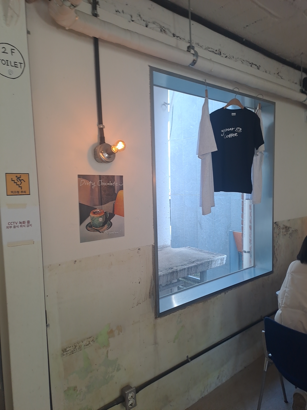 2층 단독 주택 개조 카페인 유월커피. 1층에서 2층 올라가는 길 창가 쪽 벽면에 이렇게 굿즈 티셔츠(?)도 진열되어 있었는데요.